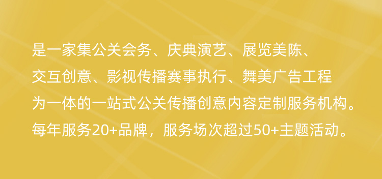 集公關會務、慶典演藝、展覽美陳、交互創意、 、舞美廣告工程為一體的一站式公關傳播創意內容定制服務機構。每年服務20+品牌,服務場次超過50+主題活動。